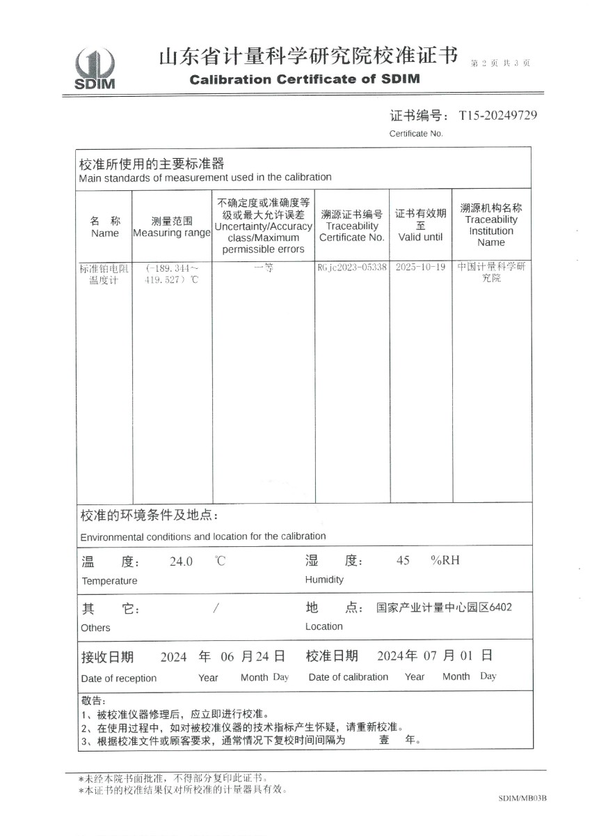 高精度數(shù)字溫度計(30~150℃)校準證書 2024-7-5 本文被閱讀 5658 次