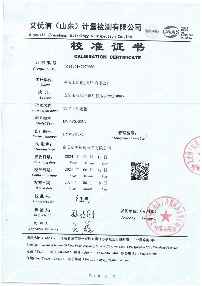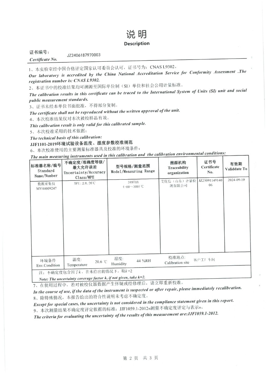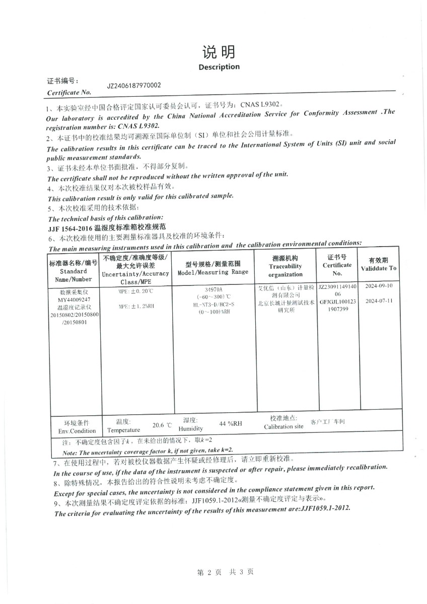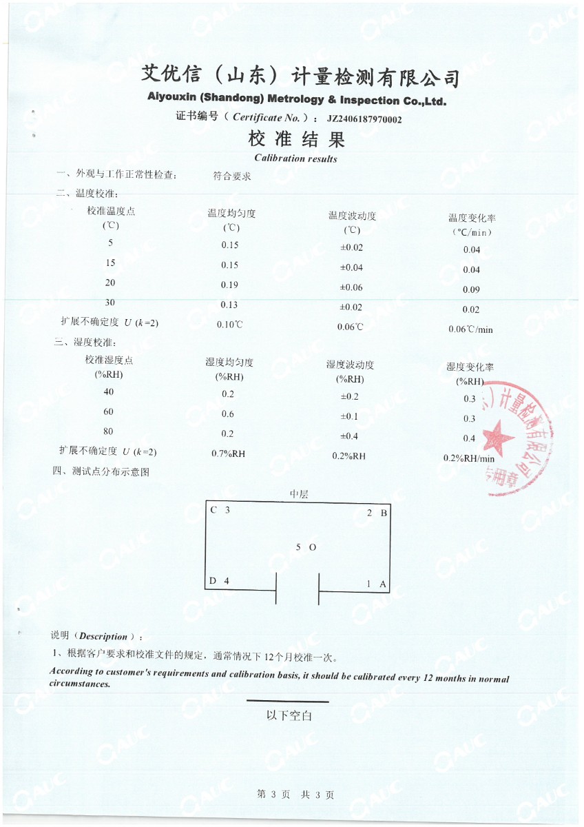 溫濕度檢定箱(-10~65℃)校準證書 2024-6-25 本文被閱讀 6070 次