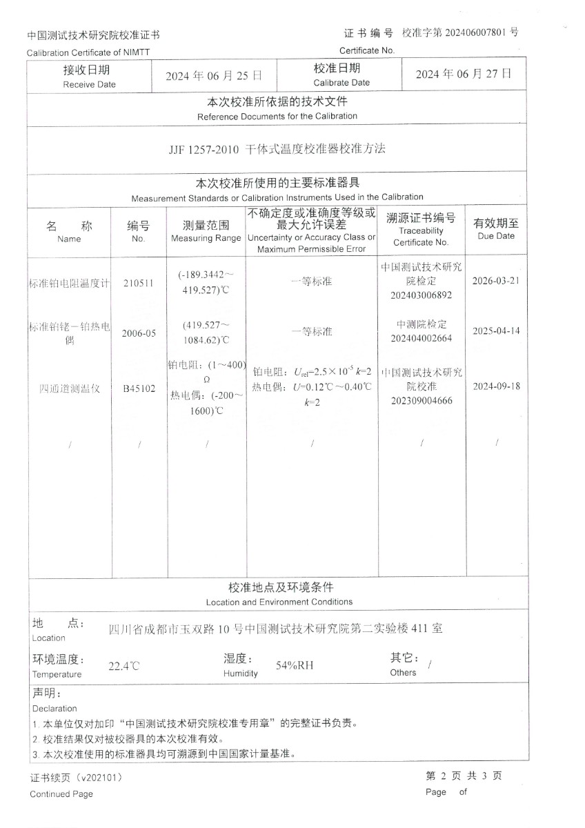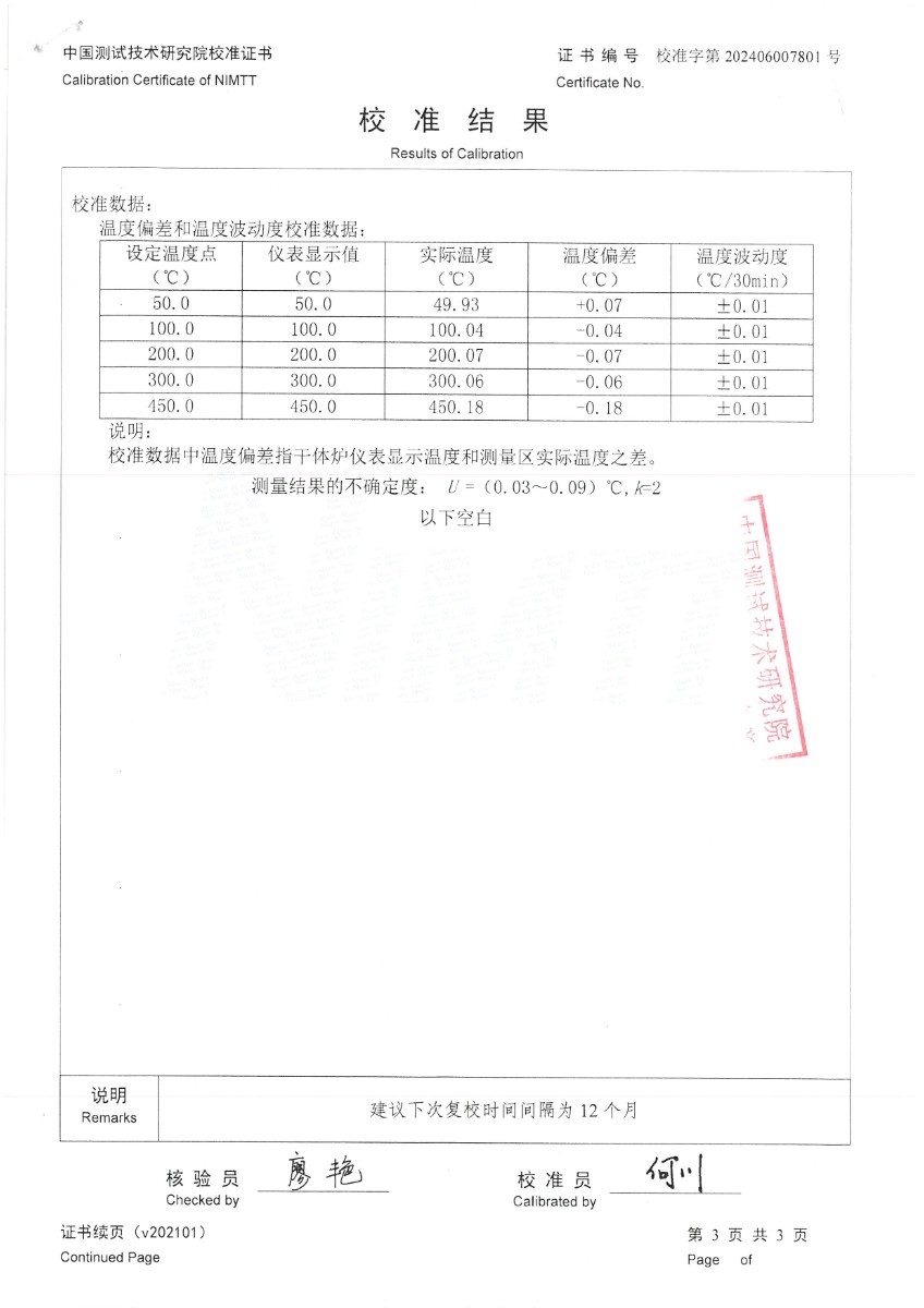 中溫干體爐(50~450℃)校準證書 2024-7-1 本文被閱讀 6013 次