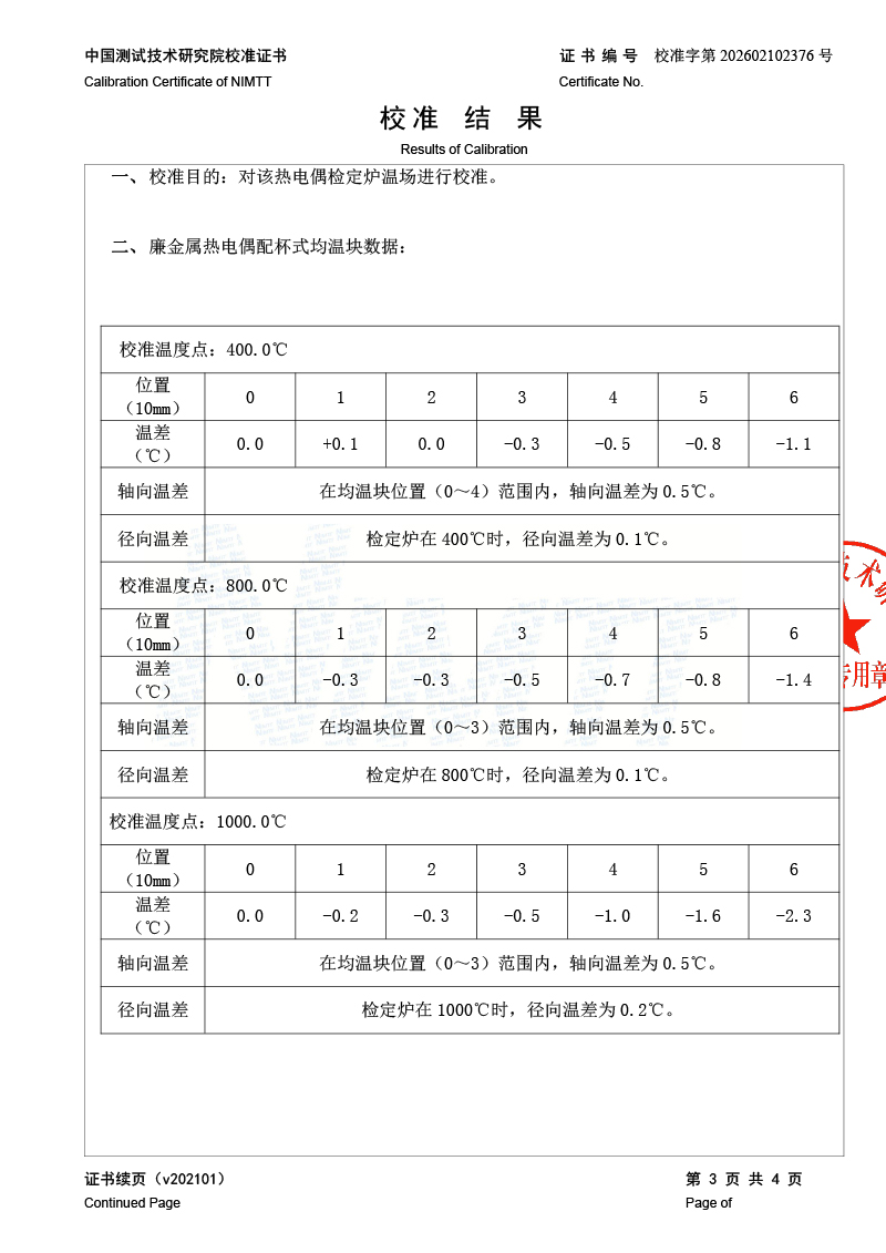 三區(qū)廉金屬熱電偶檢定爐-校準證書